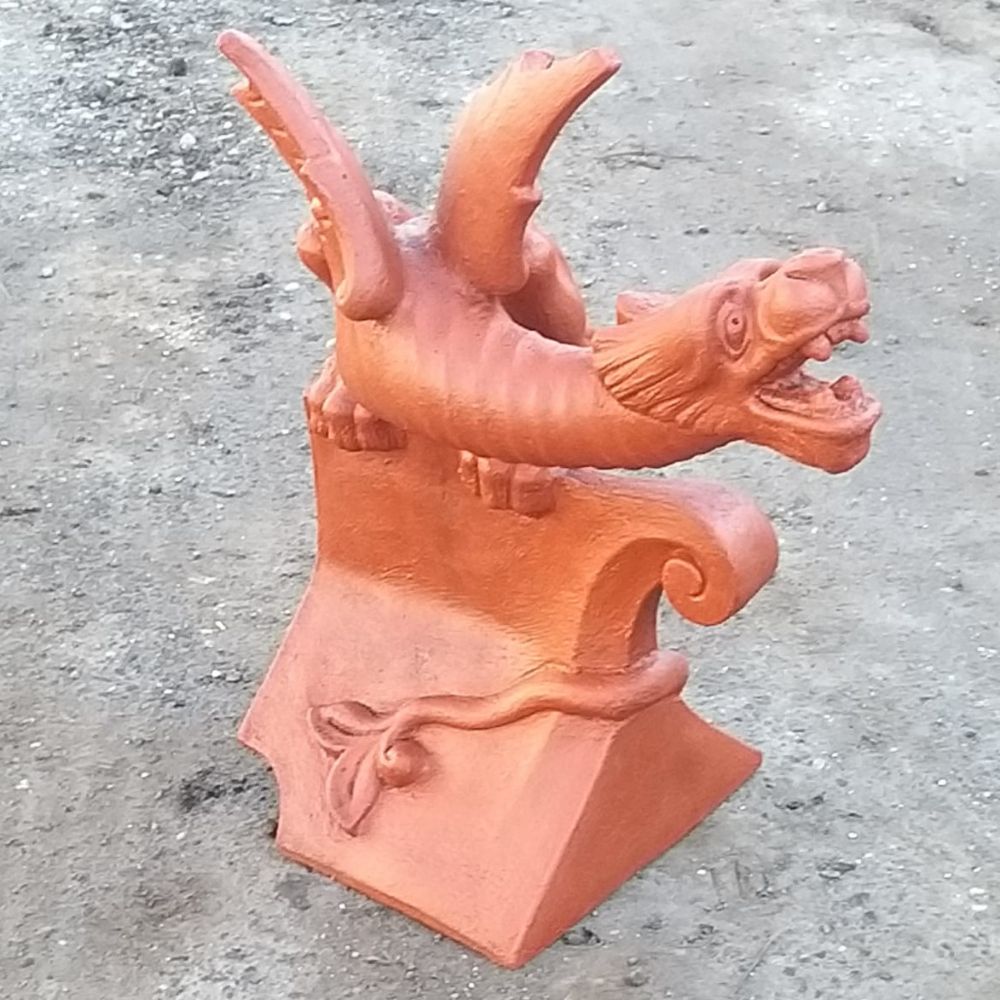 Crafted with great attention to detail, this wyvern roof finial is a stunning addition to any home. With lifelike details such as the wings, teeth, and muscular limbs, it brings the mythical creature to life. Designed to fit an angled ridge tile, it is ideal for gable ends. The unique capped end ridge at the front not only provides a decorative finish but also ensures a seamless and polished look. Based on a century old design, this finial adds timeless charm to your roofline, making it a perfect blend of artistry and functionality. wings, tail, claws and teeth